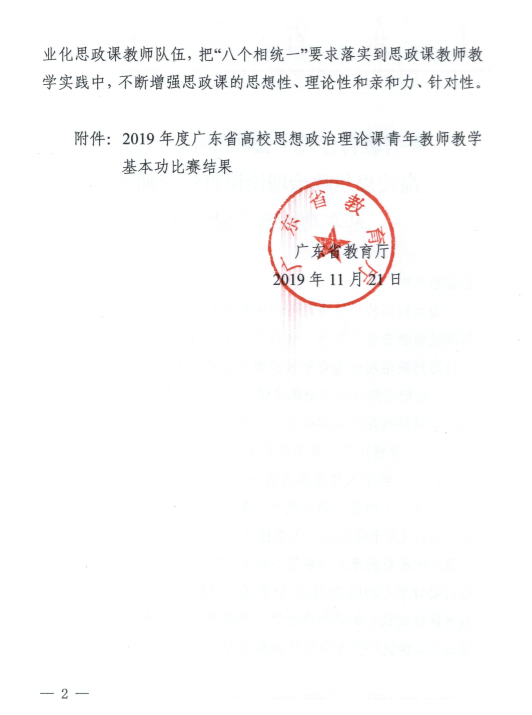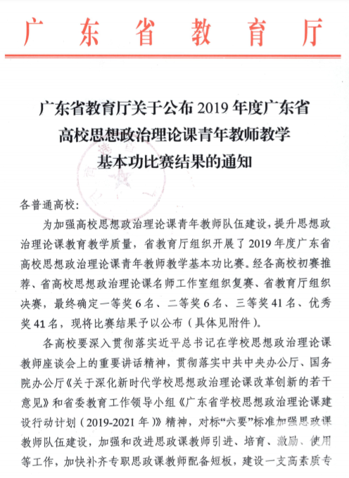 近日,广东省教育厅公布了2019年度广东省高校思想政治理论课青年教师教学基本功比赛结果,我院李艳华老师荣获《中国近现代史纲要》课程比赛三等奖。