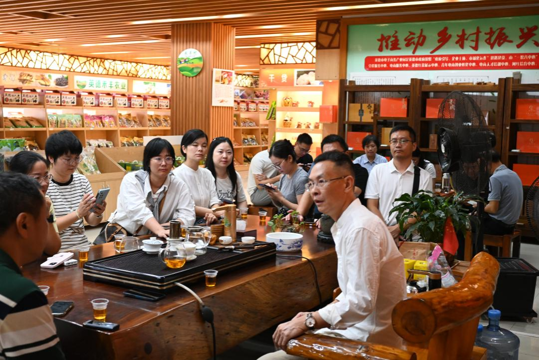 下午,研学团队前往英德市电子商务产业园,深入探寻“电商赋能乡村振兴”的广东方案。该产业园作为粤北地区推动产业数字化、破解区域发展不平衡问题的核心载体,整合“乡村振兴人才驿站、返乡创业孵化基地、农村电商产业园”三大功能,形成集引才、育才、创业、服务于一体的综合性平台。在农特产品 O2O 体验馆内,英德红茶、麻竹笋等特色农产品陈列整齐,教师们详细询问了产品从种植到线上销售的全链条流程,重点了解园区如何通过电商服务平台途径实现销量。