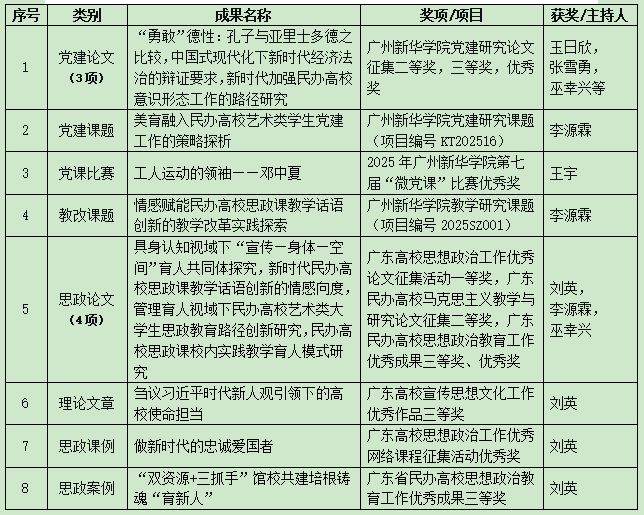 一方面,支部始终将立德树人、思政育人摆在中心位置,深耕思政教育与教改研究主阵地成效持续提升:一是教学评价有进步。支部书记刘英老师在2025年春、秋两学期期末综合评教中均位列全校前150-50名,林少淇、杨思佳、巫幸兴等党员教师在期末综合评教成绩跻身全校前500-400名,充分展现了党员教师扎实过硬的教学功底。二是科研成果有突破。支部长效化推进“老带新”机制,激发青年教师科研潜能,力求以科研创新为思政教育内涵式发展持续注入动能。刘英老师发表北大核心论文1篇、另有1篇论文获广东省高校思政论文评比一等奖,张雪勇老师发表论文2篇,巫幸兴、李源霖老师各发表论文1篇;玉日欣、张雪勇、李源霖、巫幸兴、刘英等老师的党建论文、思政论文、理论文章、思政课例及思政案例等荣获校级以上一、二、三等奖及优秀奖共计10项。三是课题研究有成效。支部党员教师发挥团队优势,合作申报并成功立项2025年校级党建、教学研究课题2项,以理论研究成果助推思想政治教育内涵式发展。